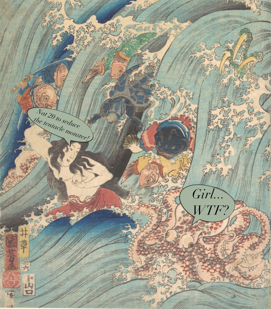 On a success: When the flumphs turn back to look at you, you step forward to the pool of liquid. Feeling a bit awkward but also maybe turned on by everyone staring, you pull your own version of a tentacle from your pants. You try to bring yourself to a quick orgasm so you’re not holding up the line. After you add your genetic material to the pool, you step back to join the crowd.