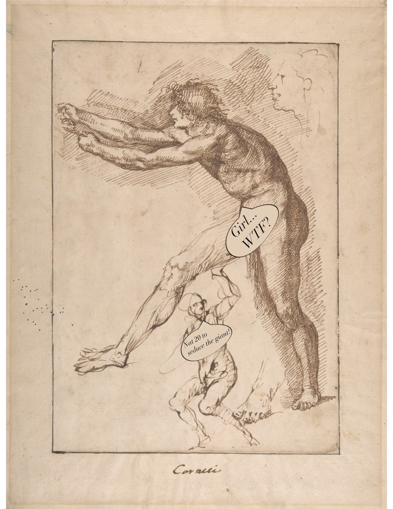 The ettin heads continue bickering in escalating tones. You blink to bring everything into focus and see, disappointingly, only one, half hard dick. It is thick, like a rod of metamagic you saw that wizard use, which would be enticing if it were not crusted with dry cum, dirt, and gods knew what else. Just looking at it makes you feel like you need a hot bath. Since the ettin doesn’t seem to be getting any more or less aroused as the heads continue arguing, you decide to gracefully take your leave.